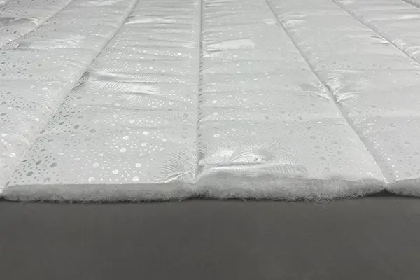Верхнее покрытие матраса жаккард, простеганный на полиэфирном волокне со спанбондом- высокопрочная ткань, состоящая из синтетических материалов с добавлением нитей из натуральных тканей с особым переплетением волокон. Смесовый жаккард может быть двойным (дублированным) или недублированным. Как правило, дублированный жаккард используют в качестве верхнего покрытия для матрасов, чехлов и наматрасников. Самой важной характеристикой ткани является его прочность и износостойкость.
